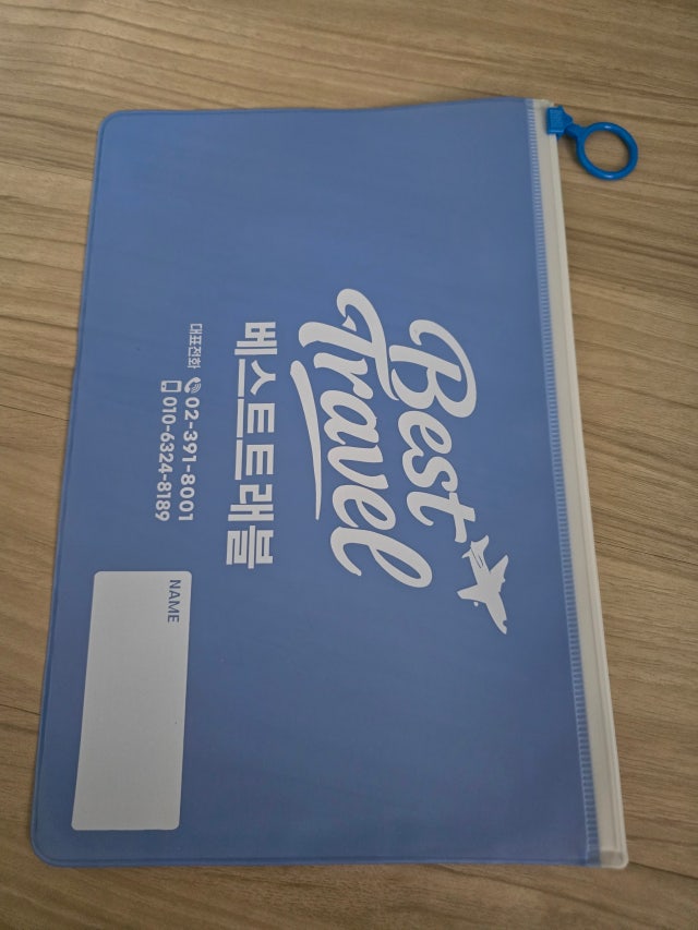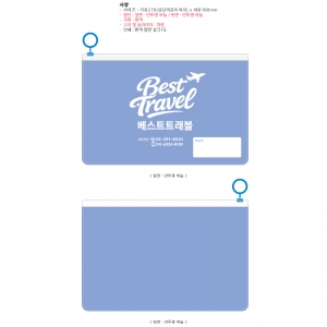[베스트트래블] 맞춤지퍼백 (사이즈27x18cm(상단라운드) +양면 반투명하늘 + 흰색 지퍼 및 파랑원형고리 + 실크1도지정색)